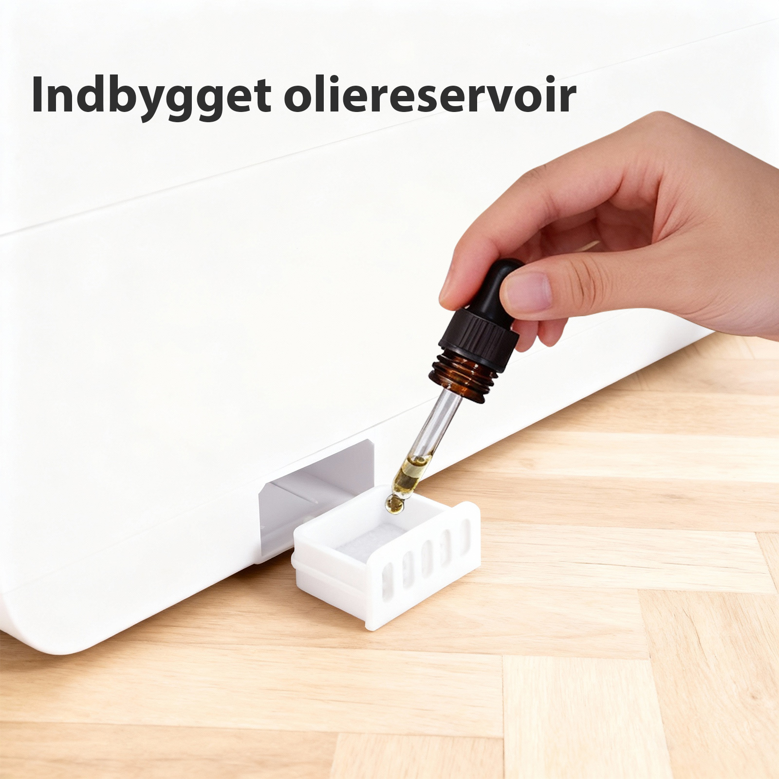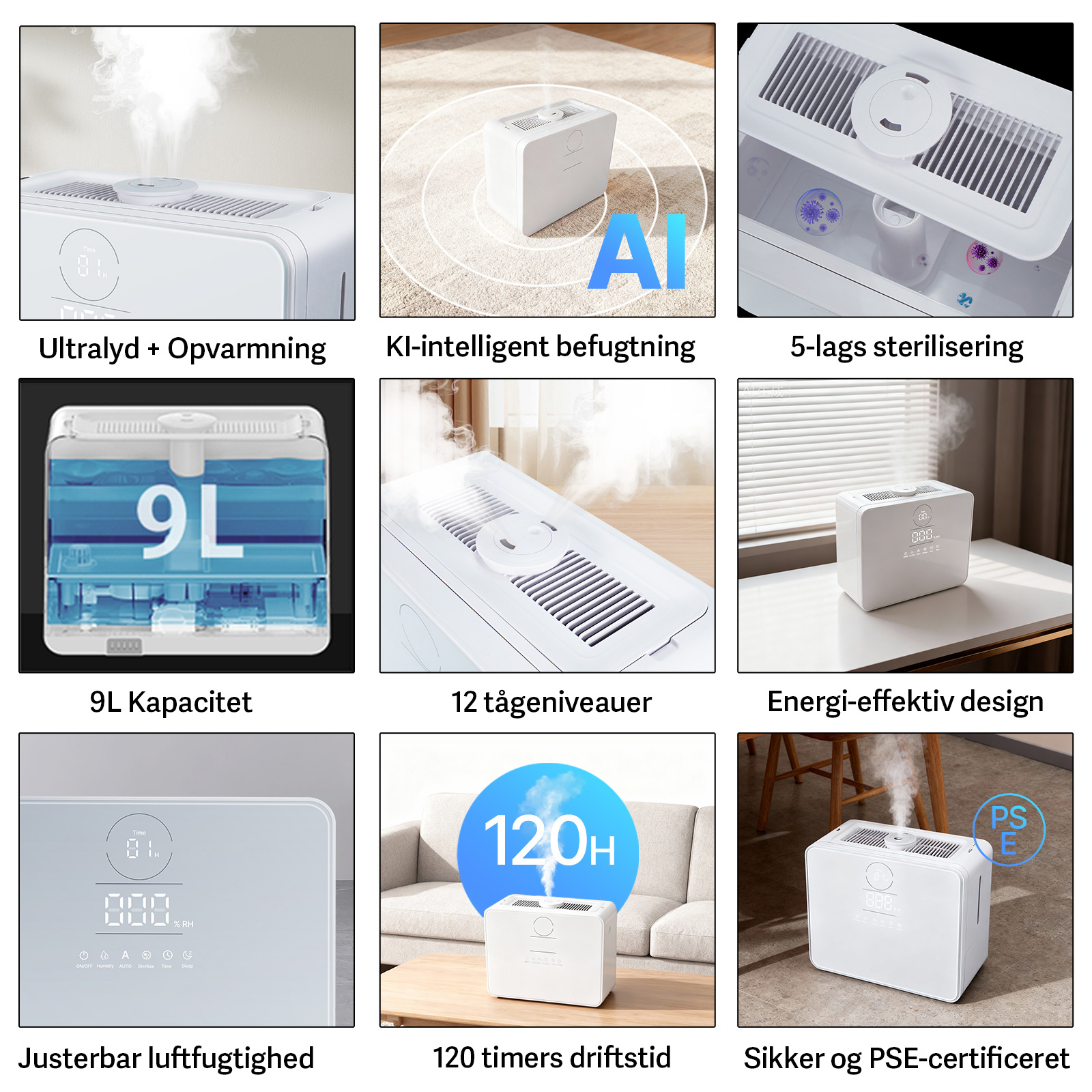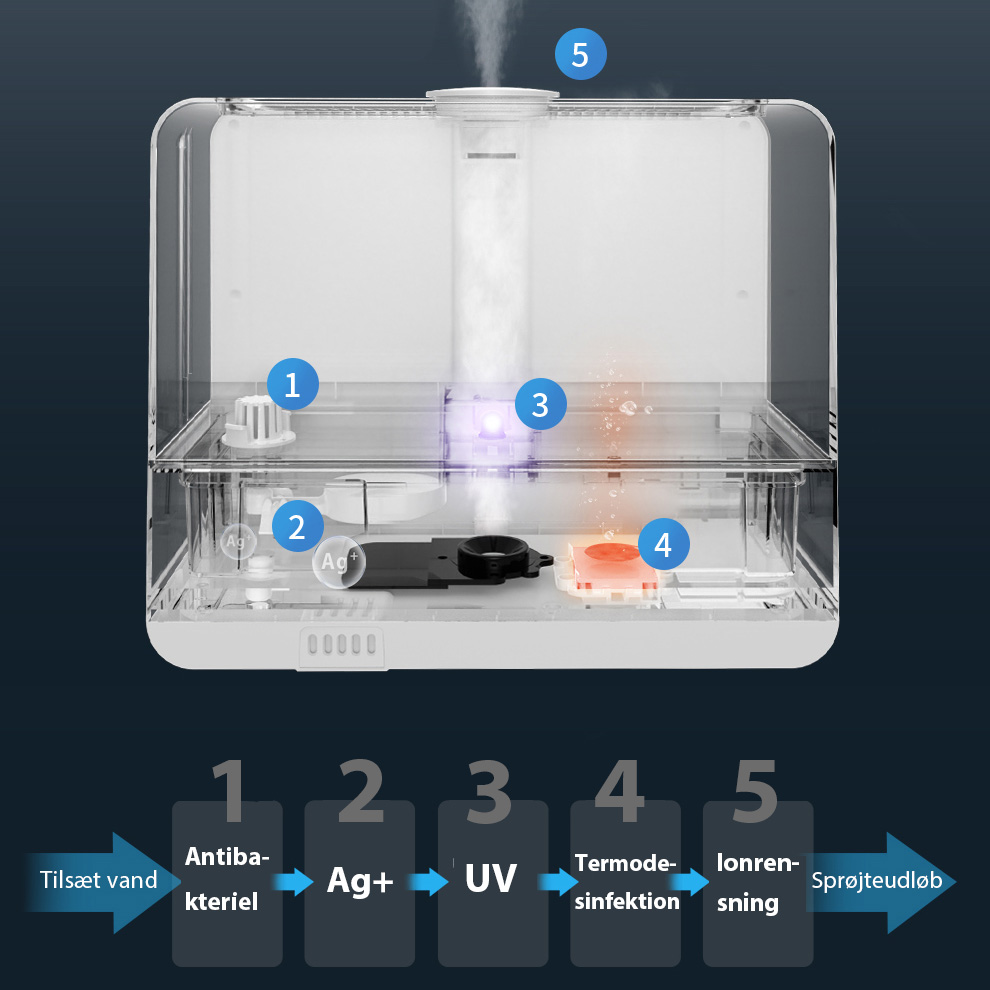 Ultralydsteknologi forstøver vandet til mikrodråber på kun 2 μm, som spredes jævnt i rummet uden at gøre overflader våde.